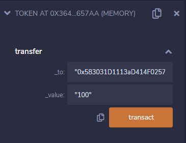 인풋 데이터에 (EOA2, 토큰수량(100))을 입력하여 transfer를 호출하면